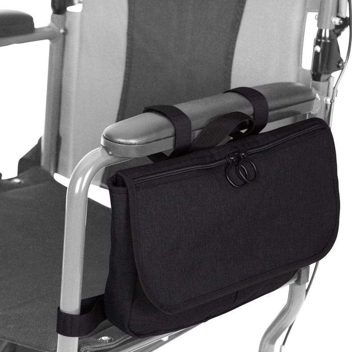 Adjustable fastener straps securely attaches the side hanging bag to wheelchairs, transport chairs, scooters, rollators and walkers